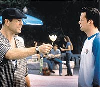 | Early on, Matthew Perry, as a nervous dentist, gets sucked into a plan to rat out the famous hitman (Bruce Willis) who has just moved into his neighborhood. Ensconced in a hotel room, Perry receives a knock on the door, and there, in all her babelicious splendor, is the hitman's estranged wife (Natasha Henstridge), who immediately comes on to him, explaining that she hasn't had sex in five years. I assumed, for a moment, that I was watching a cliché dream sequence. Why? Because Henstridge is gorgeous and Perry is starting to look like a modern descendent of Barney Rubble? Well, yes, but also because the movie has gone to such elaborate lengths to establish its hero as a clueless, fumbling loser. Even if a gangster's wife did decide to pick a lover based on his ''inner self,'' she would hardly go for this guy. |