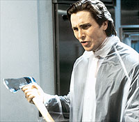 | Patrick Bateman (Christian Bale), a 26-year-old mergers and acquisitions turk, has a bottomless expense account, a society fiancée (Reese Witherspoon), and a fetishistically luxe white- on-white designer apartment. But he's a Hollow Man. He occupies a cool swank demimonde where everything, from dinner reservations to muscle tone, is a status symbol -- a signifier of identity. |